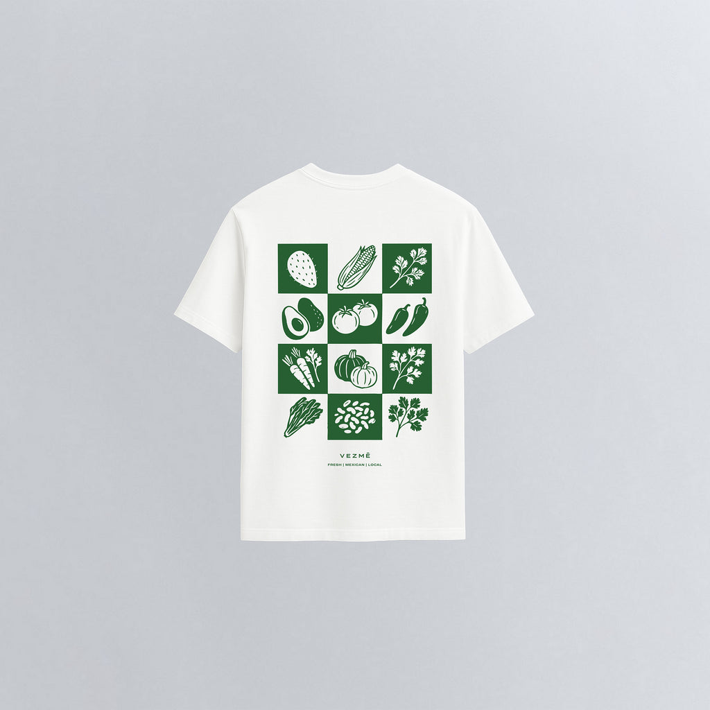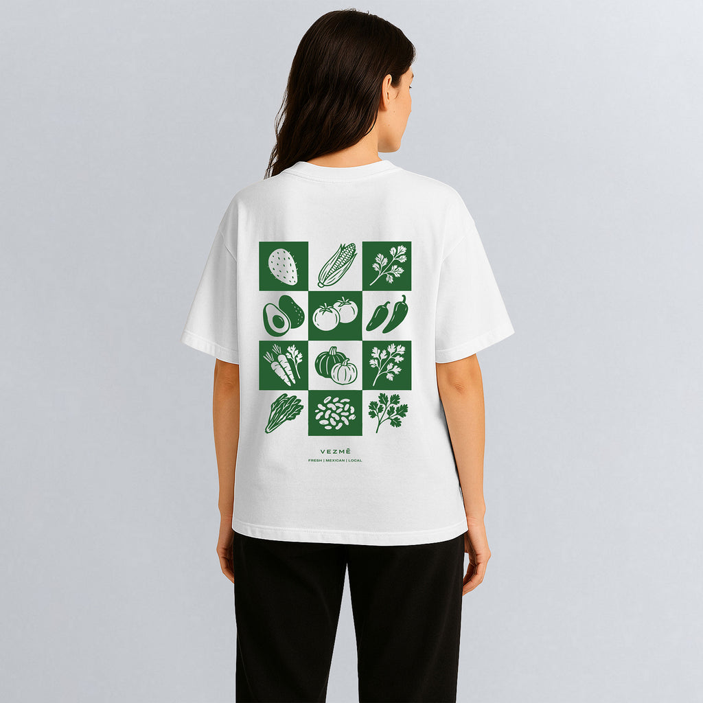 -Descripción: Nuestra playera blanca oversized tiene un corte moderno y su estampado está inspirada en ingredientes mexicanos frescos y orgánicos. Está hecha de algodón premium con materiales reciclados y cuenta con certificación de sostenibilidad Recycled yarn | GRS.