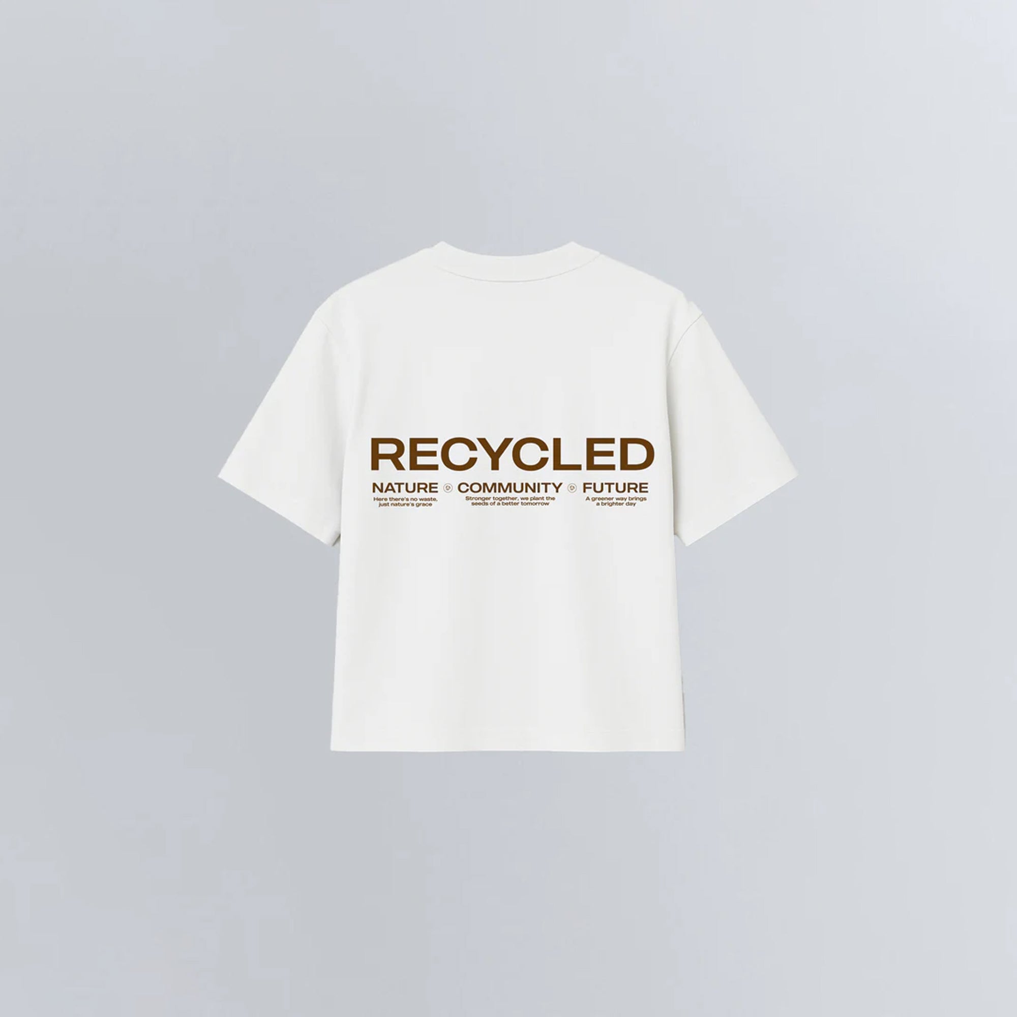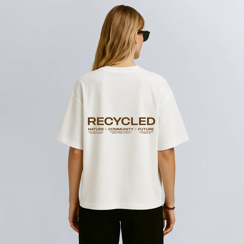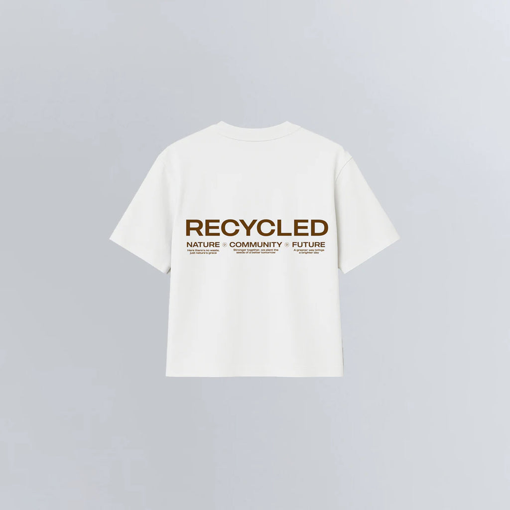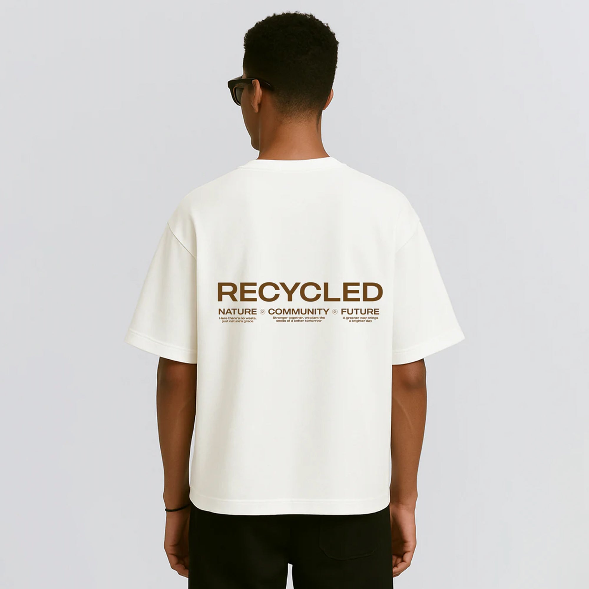 -Descripción: Esta playera tiene un corte Boxy oversized que trae el aesthetic para tu closet, dejando a ti con un aire fresh y moderno. Confeccionada en algodón premium y poliéster reciclado. Con una tela gruesa te ayuda a mantener la forma de la playera sin perder tu estilo. El estampado Recycled representa la sostenibilidad y el proprio producto que ahorra huella de carbono y recursos. Tela de alta calidad con certificado de telas Recycled yarn | GRS.