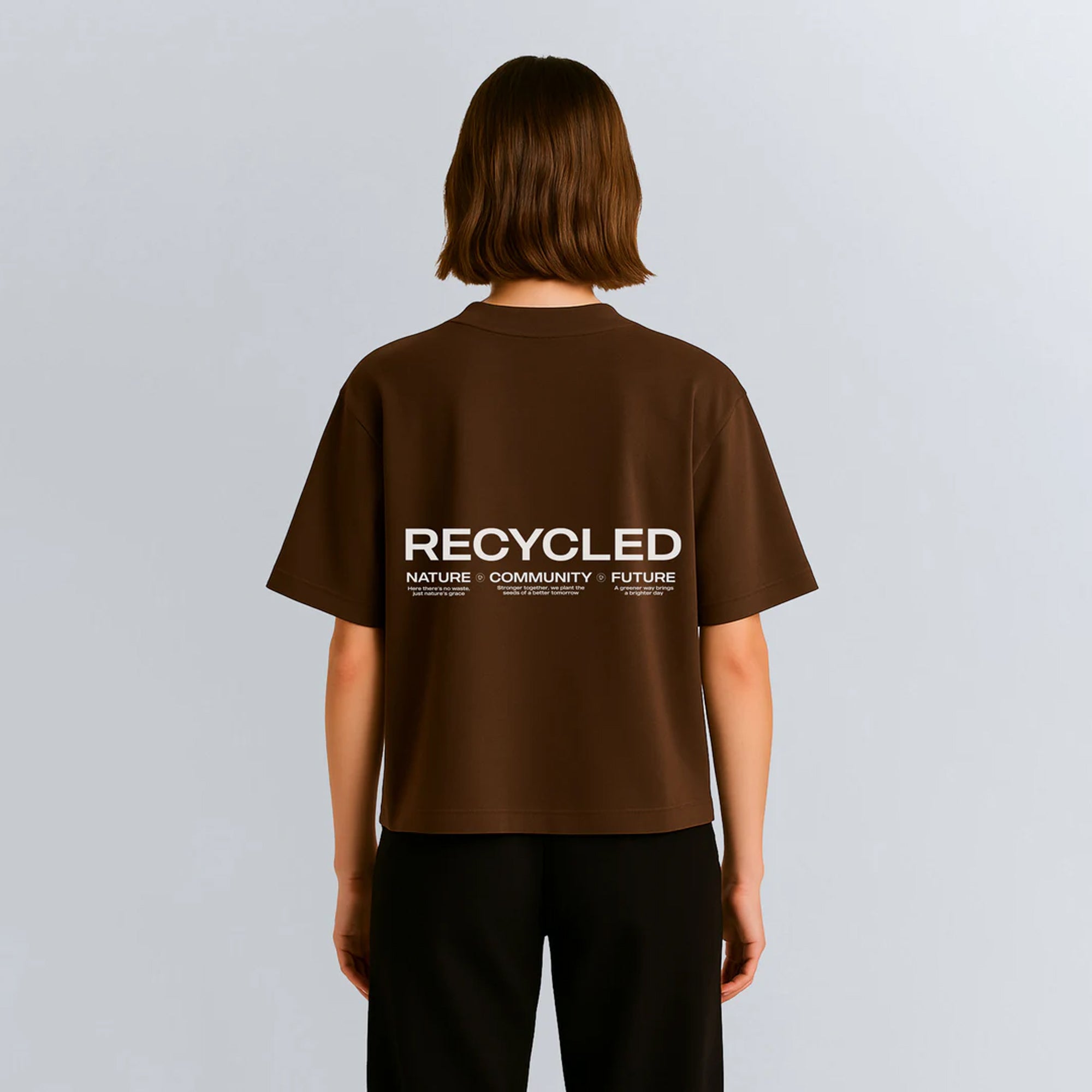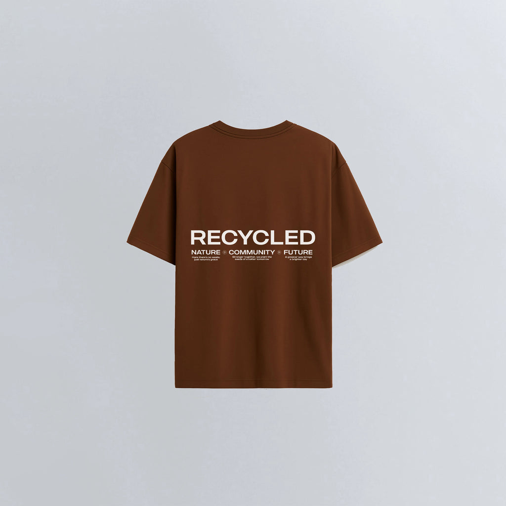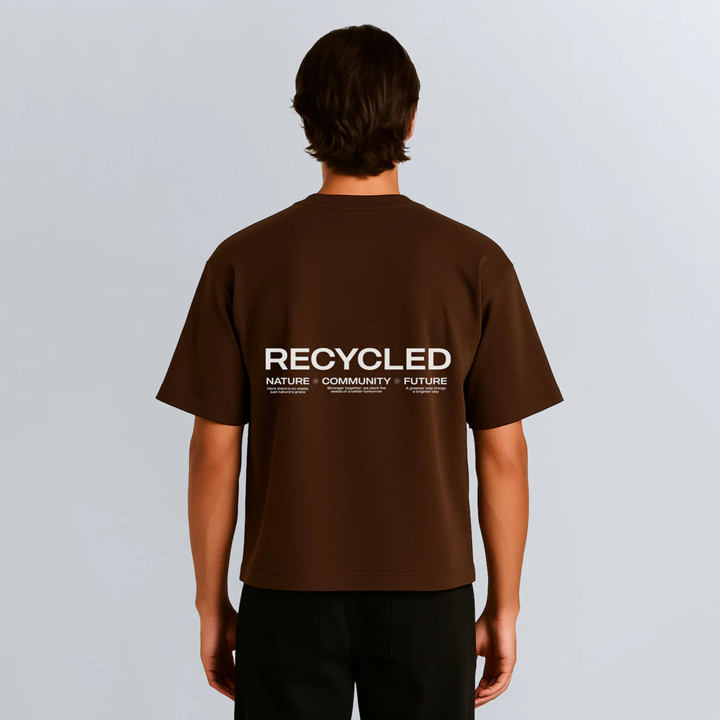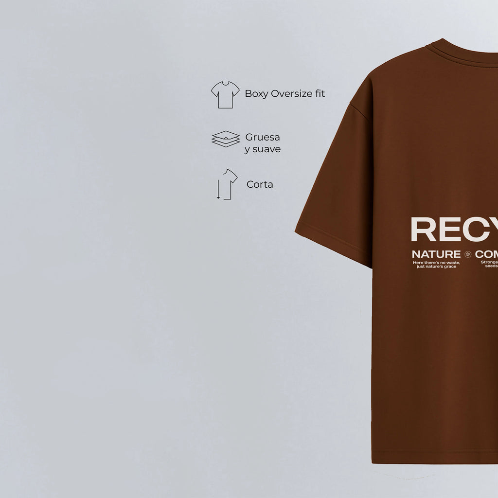 -Descripción: La playera Café Boxy Oversized que trae el aesthetic para tu closet, dejando a ti con un aire fresh y moderno. Confeccionada en algodón premium y poliéster reciclado. Con una tela gruesa te ayuda a mantener la forma de la playera sin perder tu estilo. El estampado Recycled representa la sostenibilidad y el proprio producto que ahorra huella de carbono y recursos. Tela de alta calidad con certificado de tela sostenible Recycled yarn | GRS.