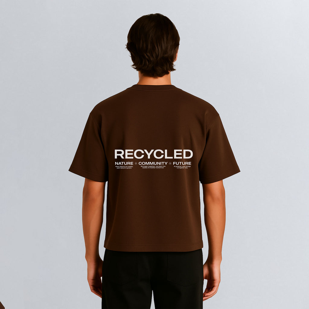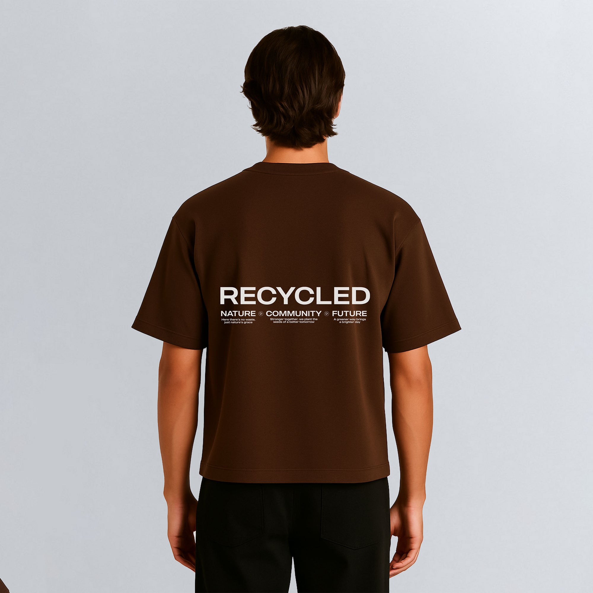 -Descripción: La playera Café Boxy Oversized que trae el aesthetic para tu closet, dejando a ti con un aire fresh y moderno. Confeccionada en algodón premium y poliéster reciclado. Con una tela gruesa te ayuda a mantener la forma de la playera sin perder tu estilo. El estampado Recycled representa la sostenibilidad y el proprio producto que ahorra huella de carbono y recursos. Tela de alta calidad con certificado de tela sostenible Recycled yarn | GRS.